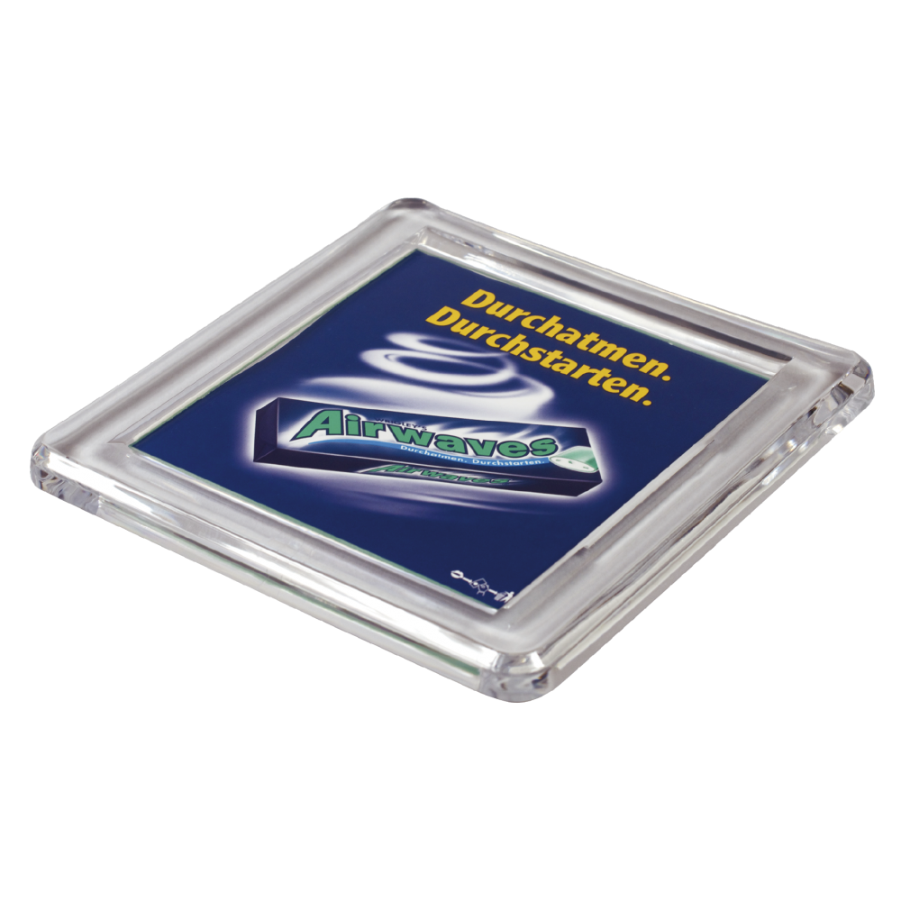 Zahlteller PG6 hat eine quadratische Form. Ein Käufer, indem er das Wechselgeld nimmt, beachtet unwillkürlich die auf dem Zahlteller untergebrachte Werbung. Er besteht aus der unteren Kunststoff-Unterlage und der oberen Rahmenfassung, die ein schlagfestes Glas darstellt. Die Elemente werden aneinender gefestigt und fixieren die Werbeetikette im Zahlteller. Der Zahlteller steht sicher auf dem Tresen, dank den auf der Unterlage angebrachten rutschfesten Füßen.