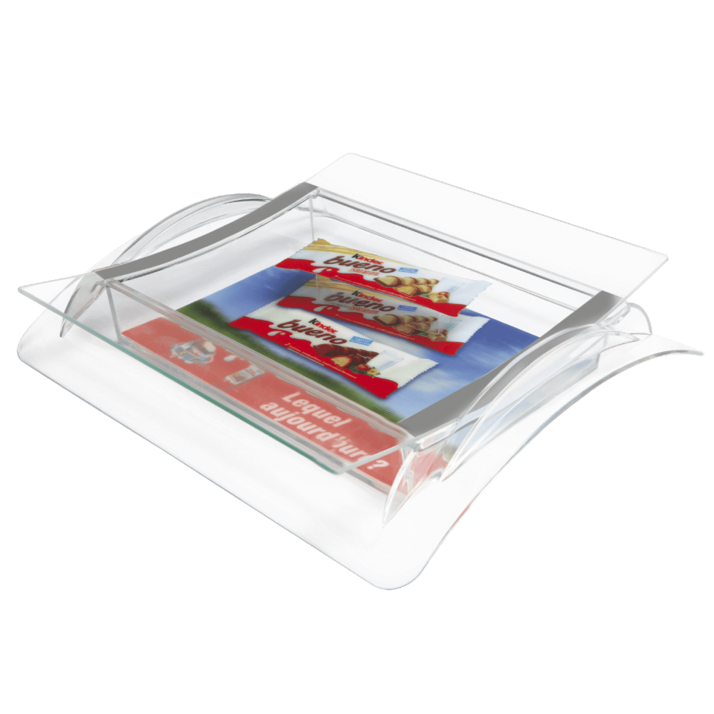 Ramasse-monaie pour la démonstration du produit consiste en deux parties: le plateau à monnaie en verre et le contenant à modèles en plastique. Un produit ou son moulage, ainsi qu'une étiquette publicitaire en papier sont fixés fermement dans la partie inférieure, de sorte que le ramasse-monnaie remplit la fonction supplémentaire d'un display dans la zone de caisse. La partie supérieure en verre peut être fixée à la base à l'aide d'une bande adhésive double-face ou des filets magnétiques, ce qui permet de changer facilement le produit et l'étiquette publicitaire. Fabriqué en matière plastique solide et a quatre pieds antidérapants et les bords surélevés, prévenant la dissémination des monnaies sur la surface.